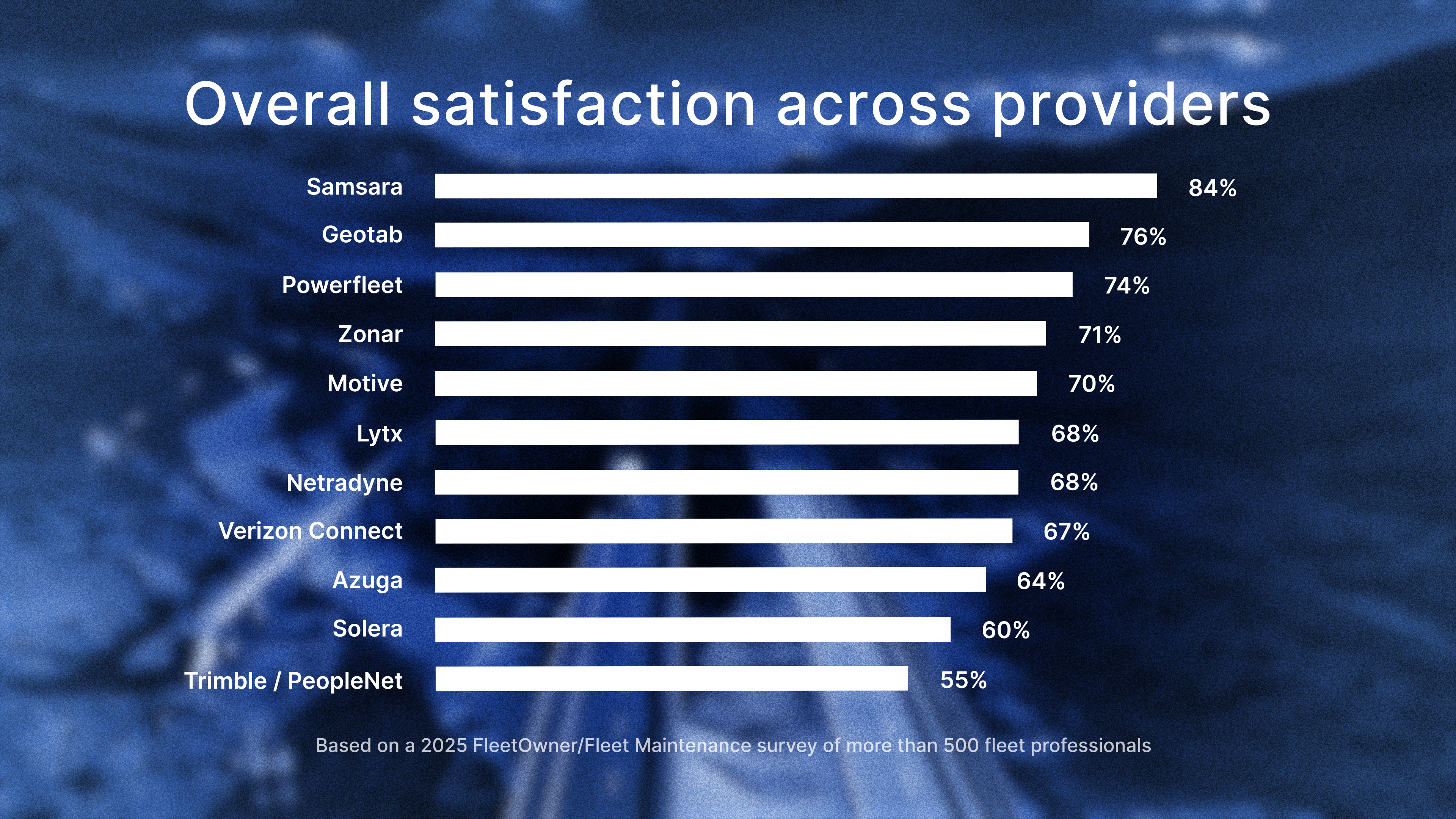 Samsara leads the industry in trust and satisfaction for fleet technology providers amongst fleet professionals.